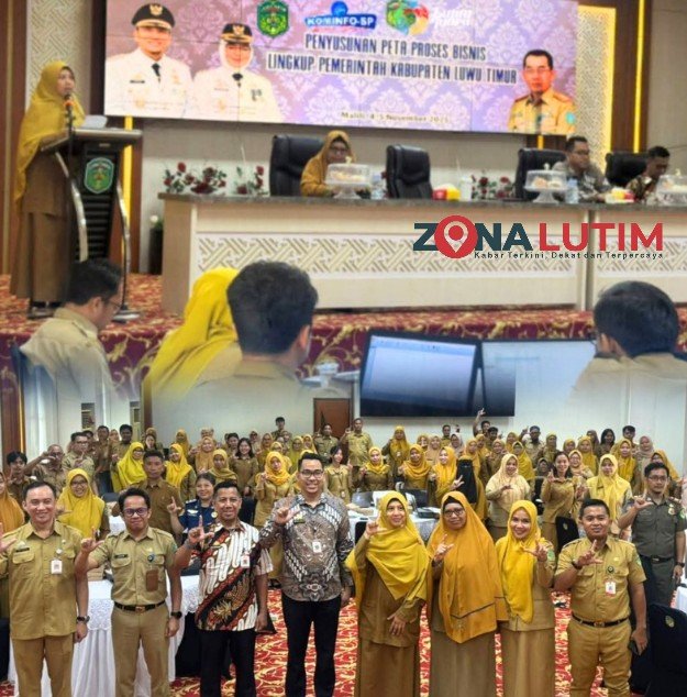 Lutim, Zonalutim.com – Sebagai tindak lanjut dari ketentuan Peraturan Menteri PANRB Nomor 19 Tahun 2018 tentang Penyusunan Peta Proses Bisnis Instansi Pemerintah, maka Pemerintah Kabupaten Luwu Timur melaksanakan kegiatan Penyusunan Peta Proses Bisnis (Probis) yang berlangsung di Aula Sasana Praja Kantor Bupati, Selasa (04/10/2025).